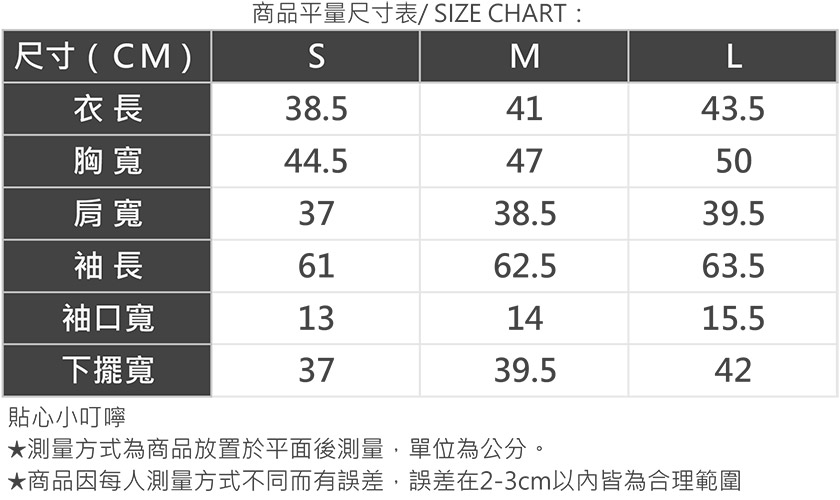| 版型 | 貼身 | 1 | 2 | 3 | 4 | 5 | 寬鬆 |