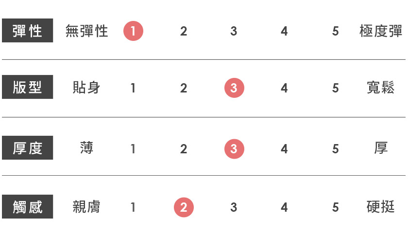 | 觸感 | 親膚 | 1 | 2 | 3 | 4 | 5 | 硬挺 |