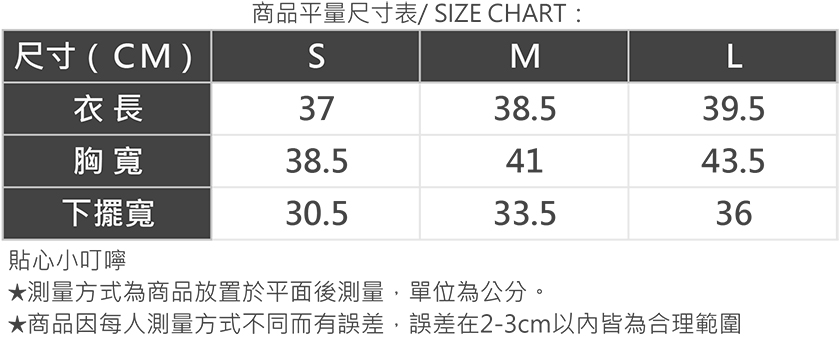 不確定自己的尺寸嗎?別擔心,我們幫你搞定。你可以參考下方商品評量尺寸表或是身材測量方式找到最適合你的尺碼,如果還有疑問也歡迎隨時聯繫我們的客服團隊。