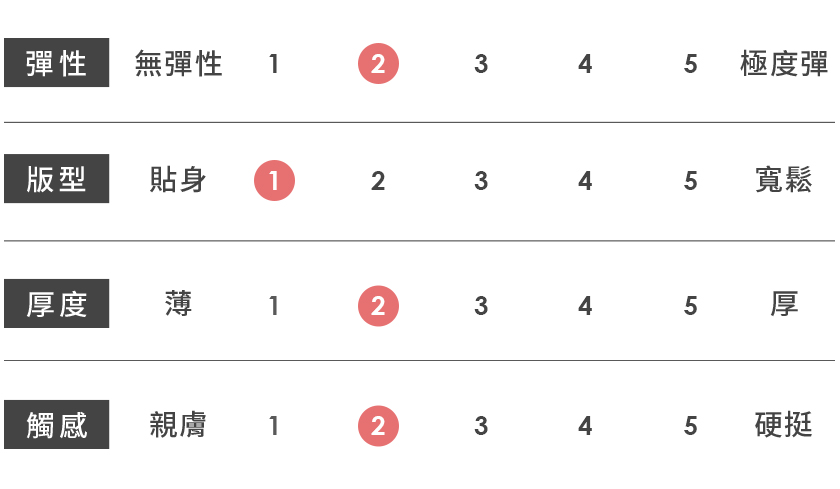 | 觸感 | 親膚 | 1 | 2 | 3 | 4 | 5 | 硬挺 |