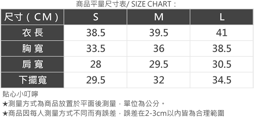 | 版型 | 貼身 | 1 | 2 | 3 | 4 | 5 | 寬鬆 |
