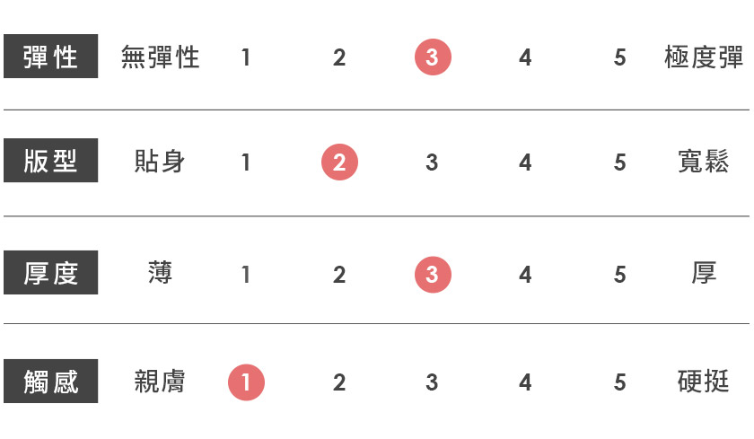 | 觸感 | 親膚 | 1 | 2 | 3 | 4 | 5 | 硬挺 |