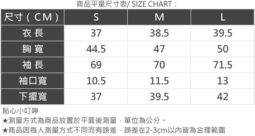 | 版型 | 貼身 | 1 | 2 | 3 | 4 | 5 | 寬鬆 |