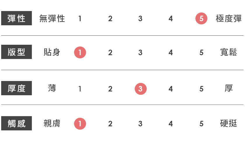 | 彈性 | 無彈性 | 1 | 2 | 3 | 4 | 5 | 極度彈 |