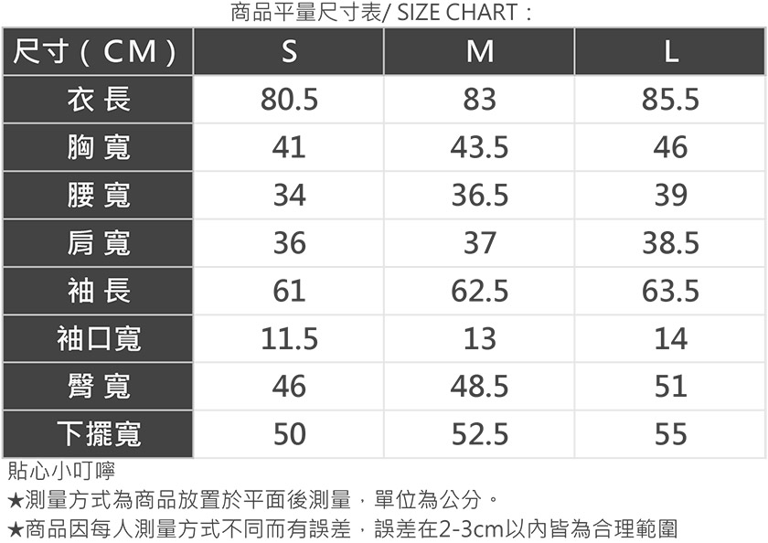 | 版型 | 貼身 | 1 | 2 | 3 | 4 | 5 | 寬鬆 |