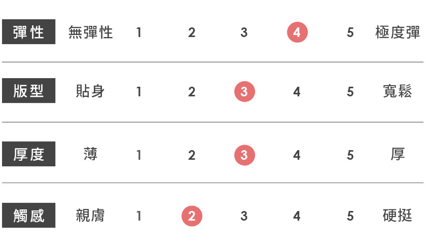 | 觸感 | 親膚 | 1 | 2 | 3 | 4 | 5 | 硬挺 |