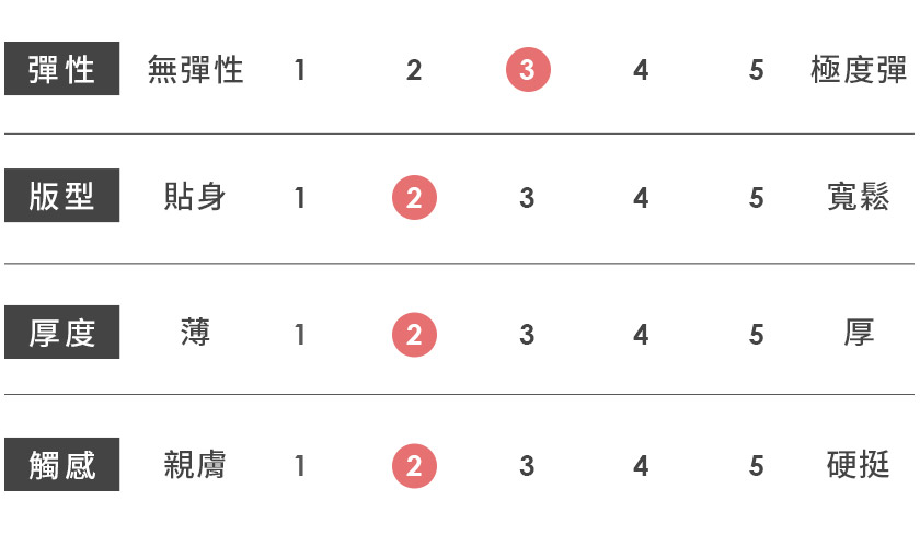 | 觸感 | 親膚 | 1 | 2 | 3 | 4 | 5 | 硬挺 |