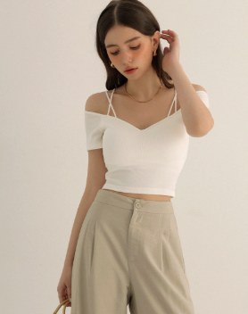 交叉雙肩帶V型一字領短袖短版上衣(附胸墊)
