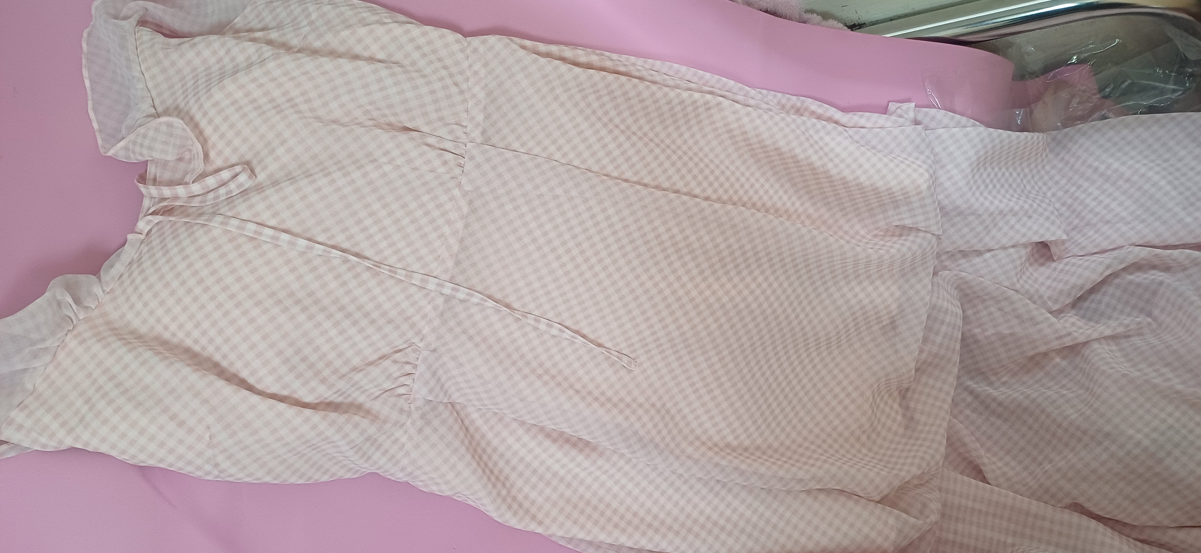 荷葉領綁帶微透肌格紋無袖長洋裝(附胸墊)