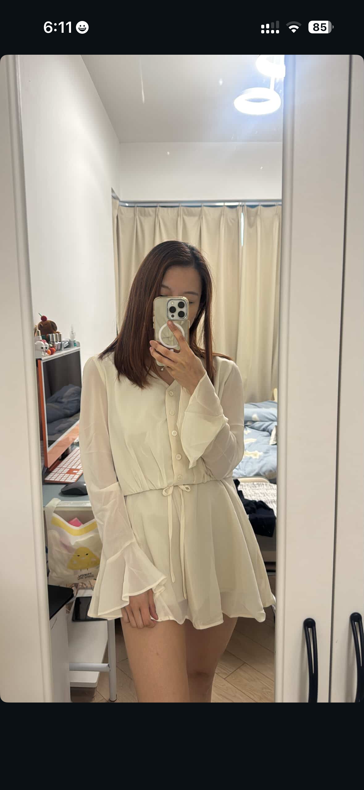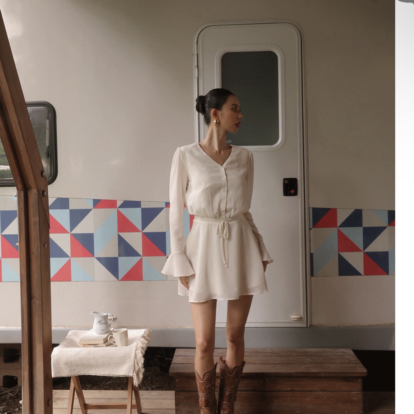 V領排扣喇叭袖後鏤空綁帶透膚雪紡短洋裝