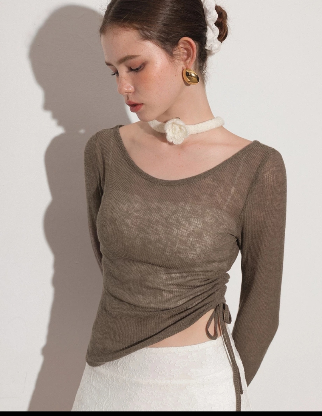 2WAY大圓領側抽繩長袖透膚針織上衣