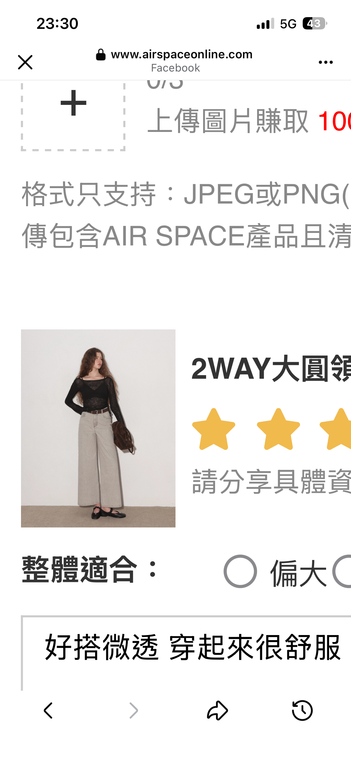 | 版型 | 貼身 | 1 | 2 | 3 | 4 | 5 | 寬鬆 |