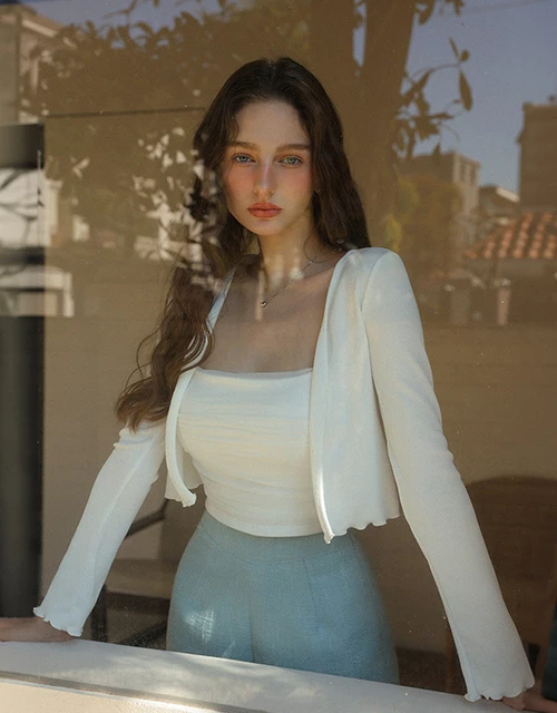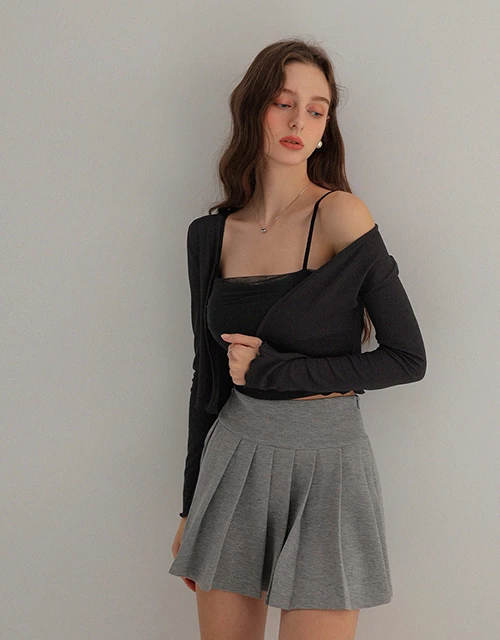木耳邊長袖罩衫透紗細肩帶背心套裝(附胸墊)