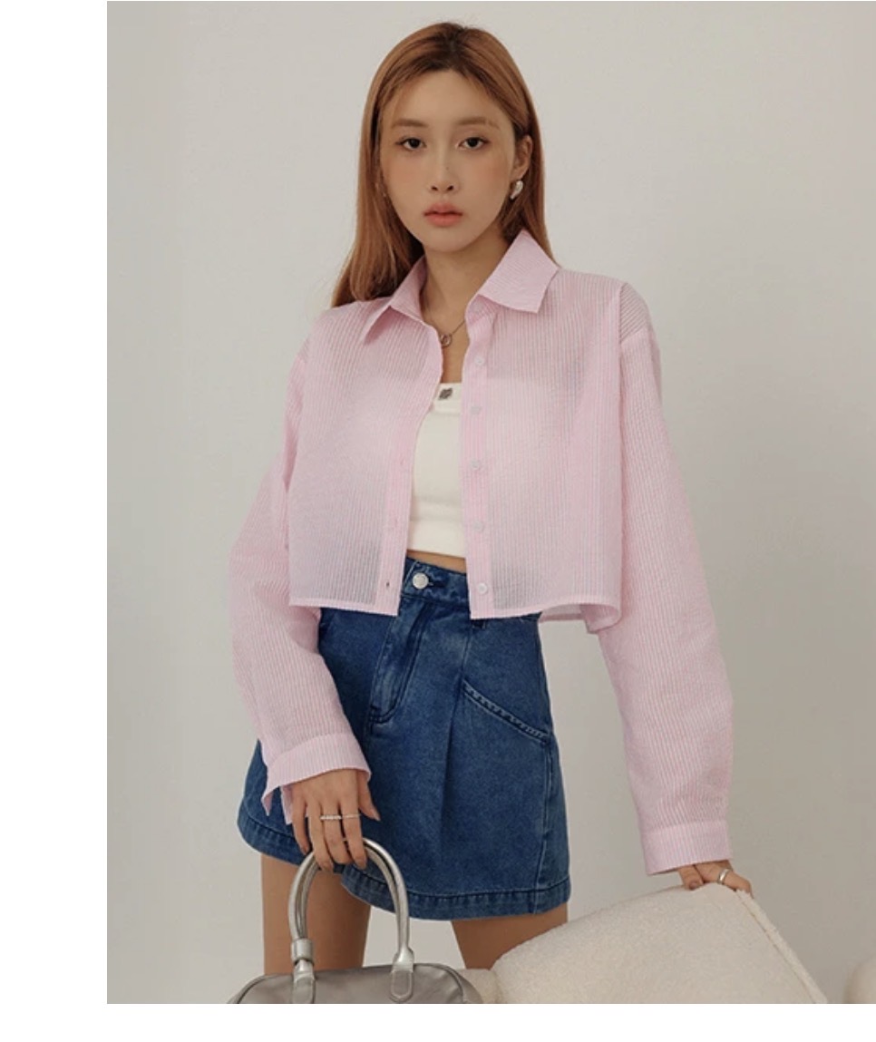 條紋泡泡紗長袖短版襯衫條紋泡泡紗長袖短版襯衫