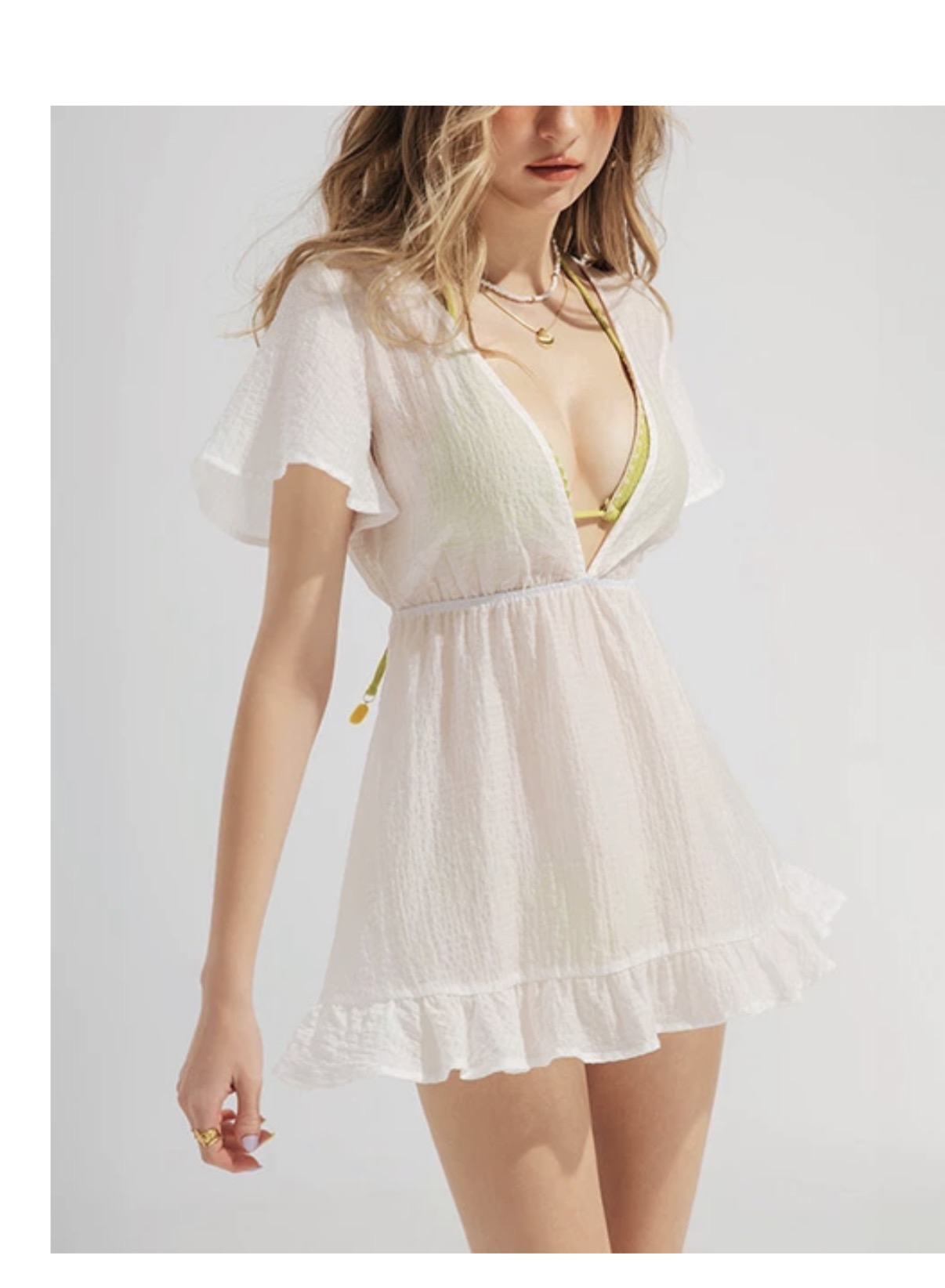 深 V領傘袖後綁帶荷葉邊外罩短洋裝