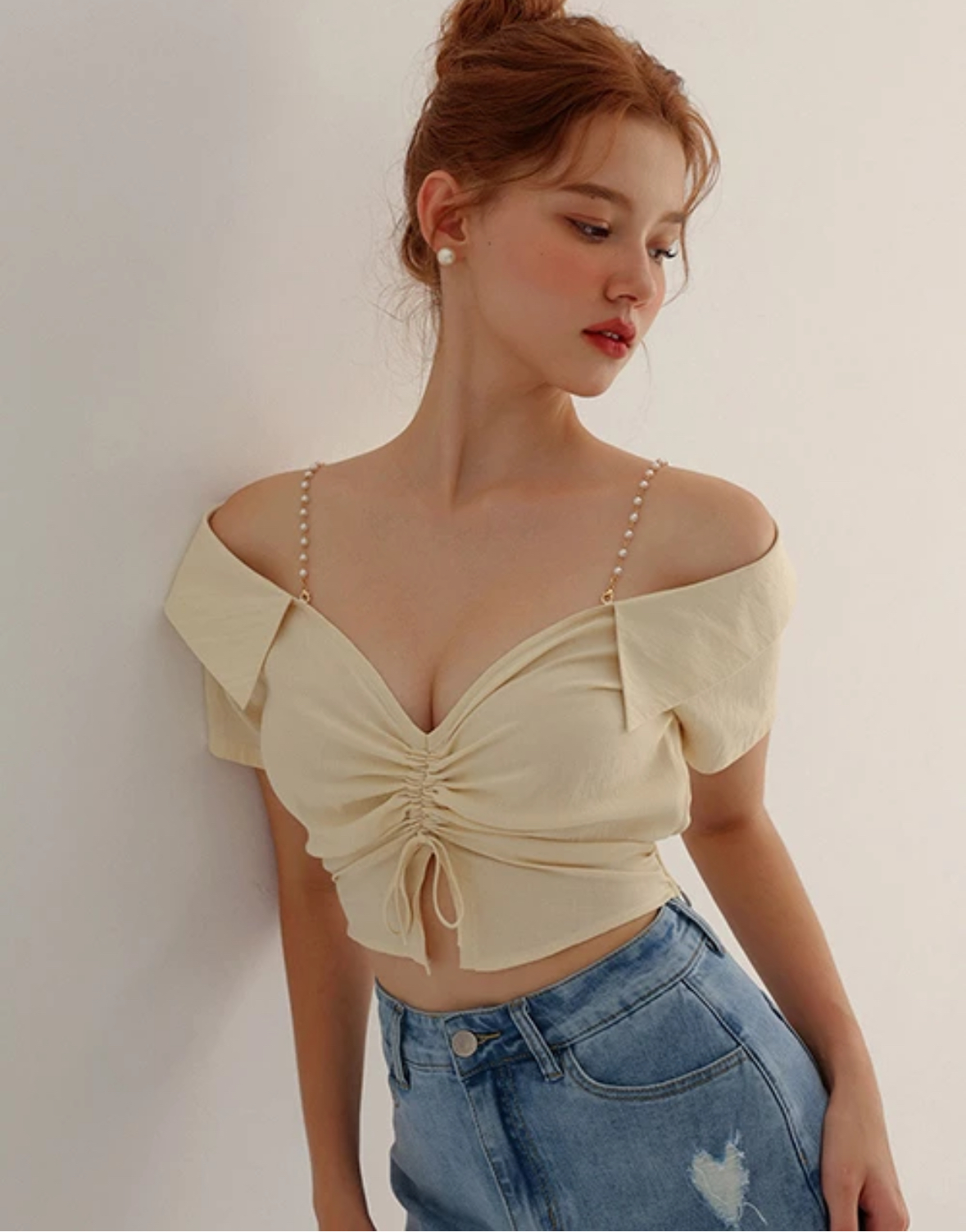 V型翻領珍珠鍊肩帶抽繩短袖短版上衣