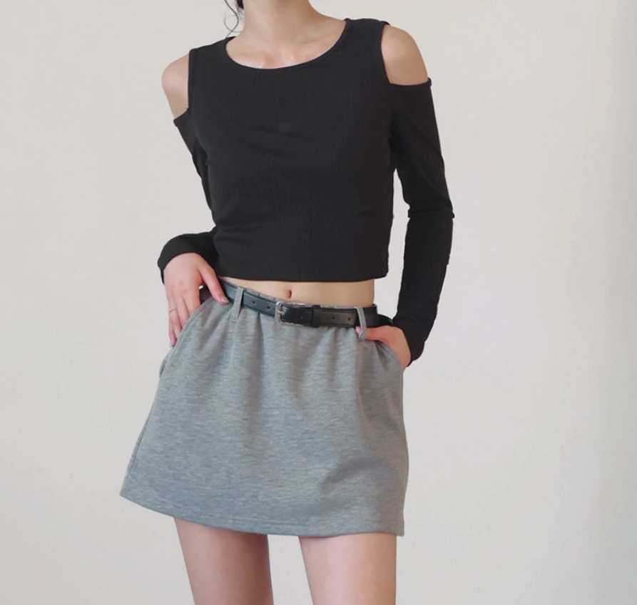 圓領雙肩挖空長袖壓紋短版上衣