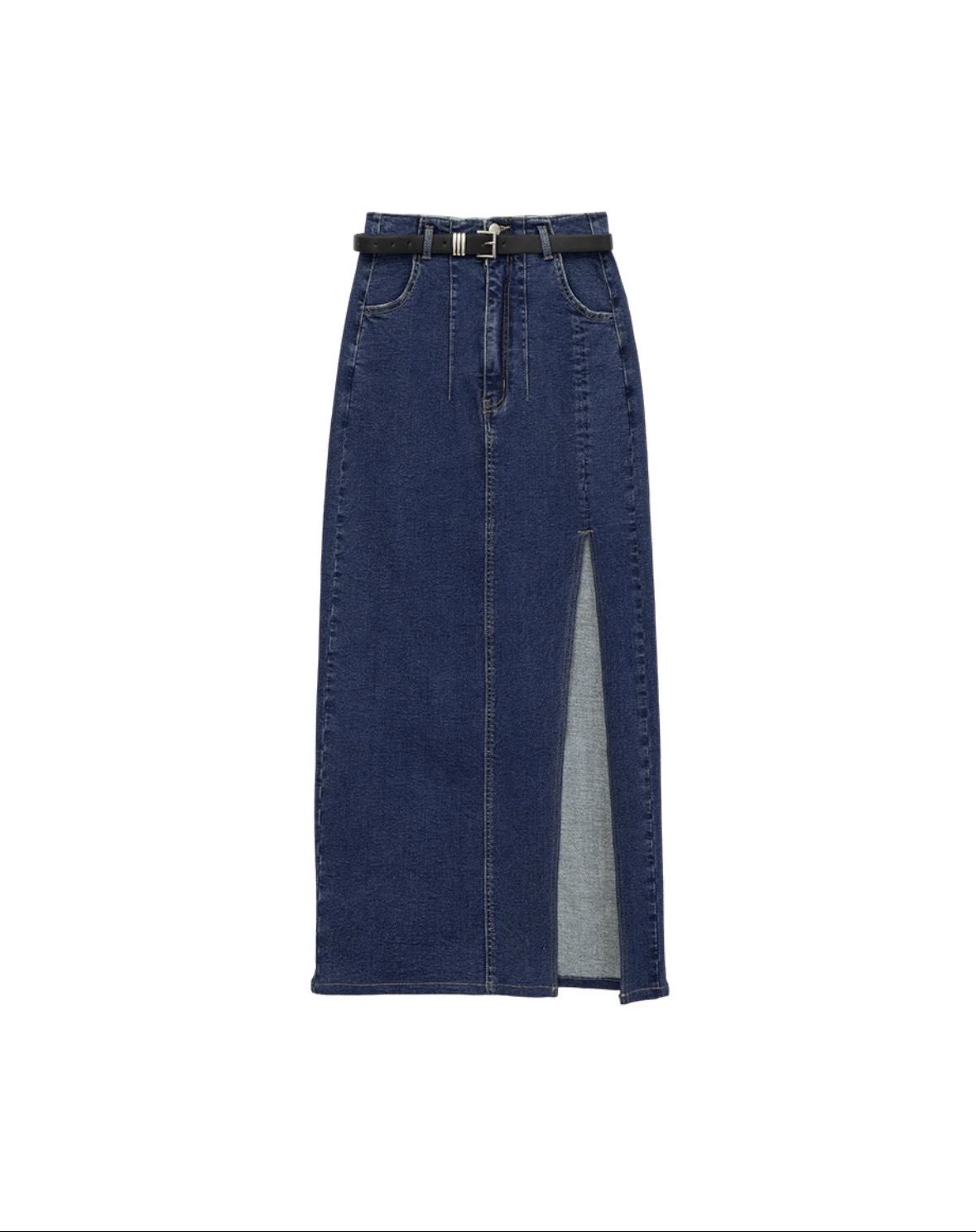 高腰側開衩內磨毛直筒牛仔長裙(附腰帶)
