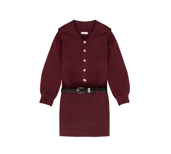 水手領排扣開襟長袖針織短洋裝(附皮帶)