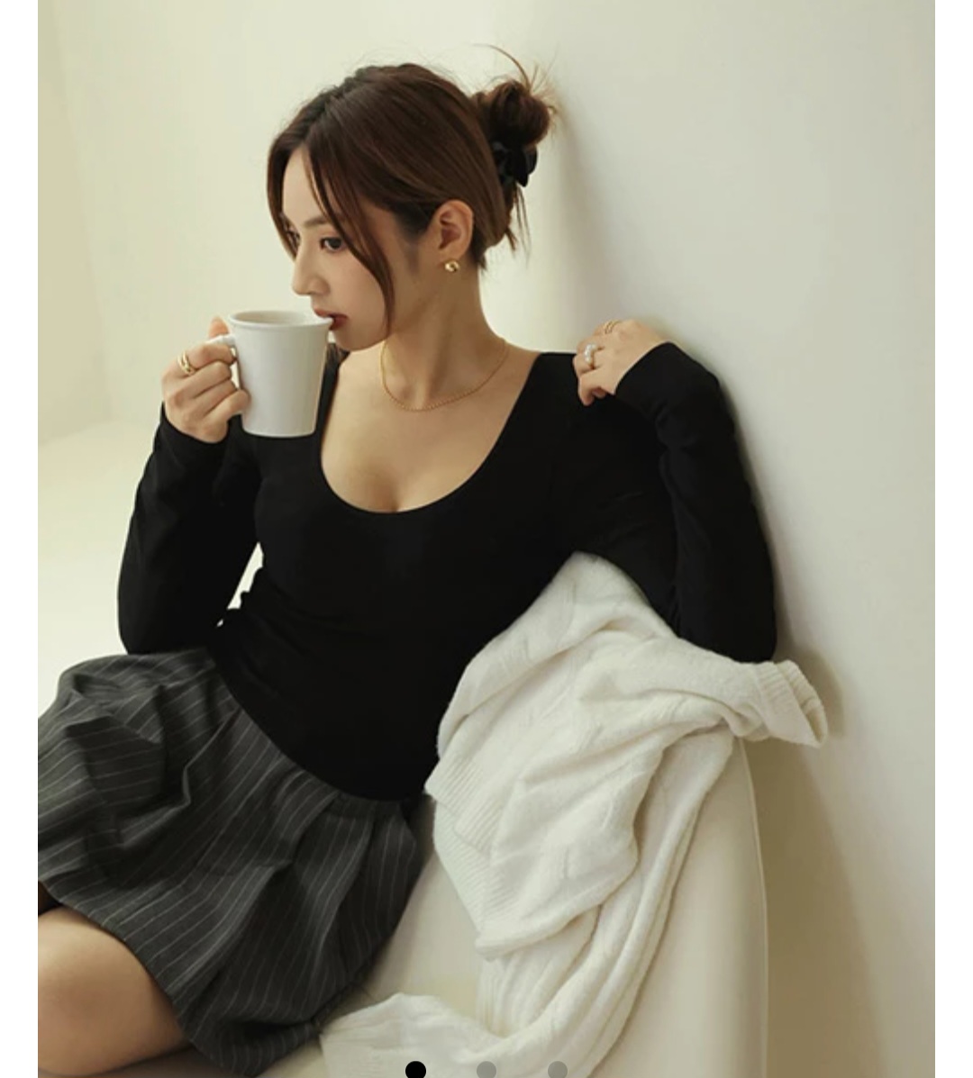 一字領與雙肩的綁帶、背後一字細帶的組合在前後皆形成設計重點。露出肩頸線條的剪裁讓整體顯得輕盈,澎袖輪廓帶出慵懶氣息。長版版型穿起來有包覆度但不厚重,適合柔和有個性的日常穿搭造型。
