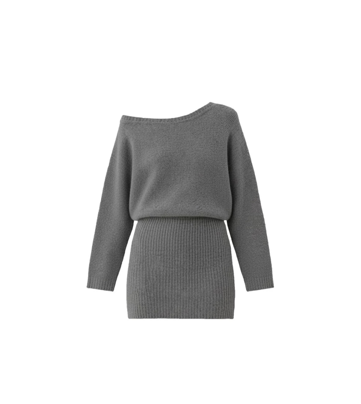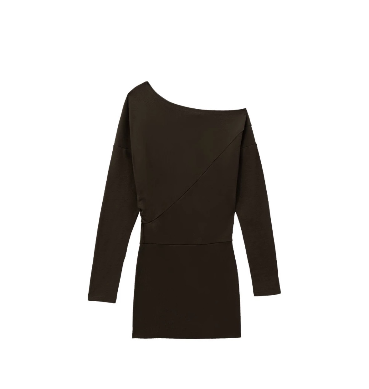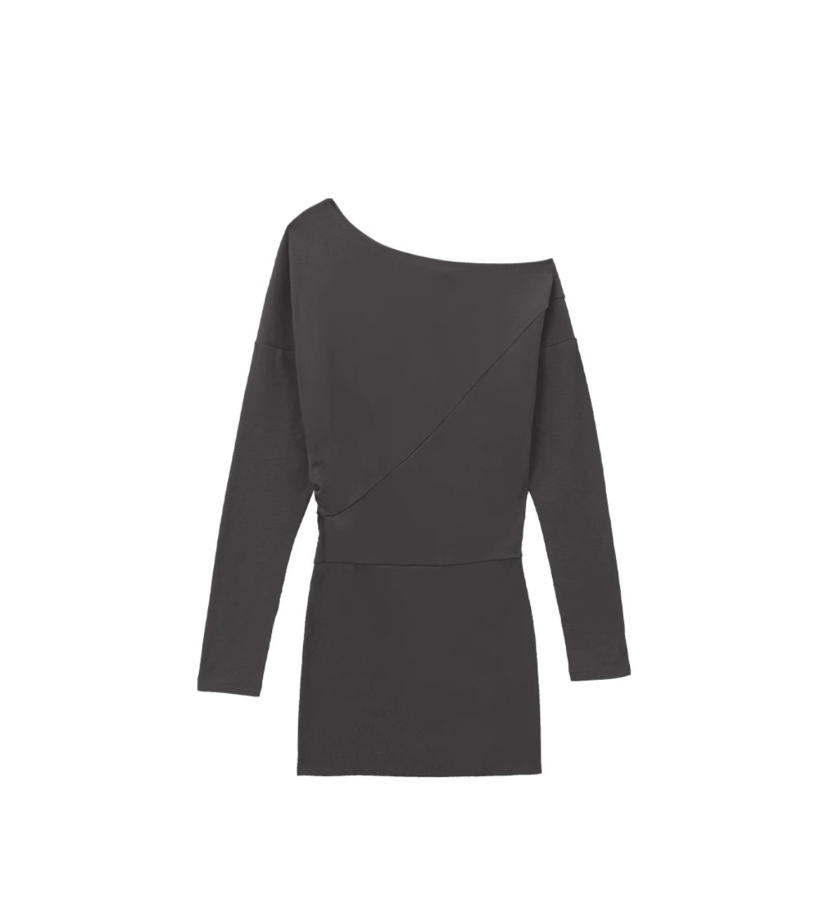 不對稱領口結合斜向拼接設計,巧妙修飾肩頸線條,側邊抓皺增添版型的立體感,並具有顯瘦效果。低腰線的合身裙能襯托腰臀曲線,穿起來更為性感。