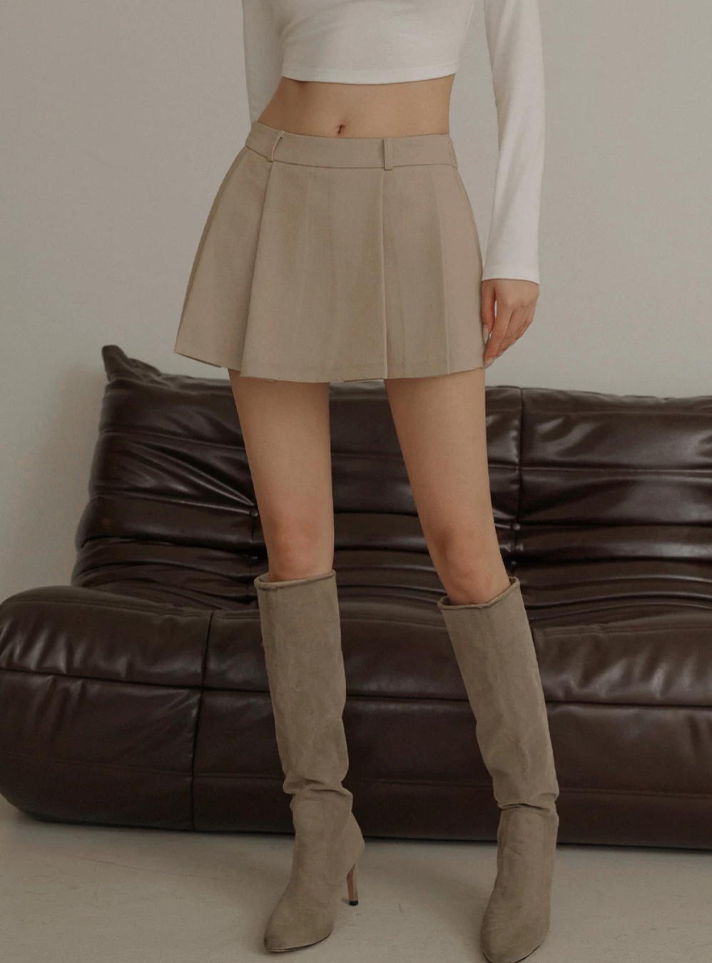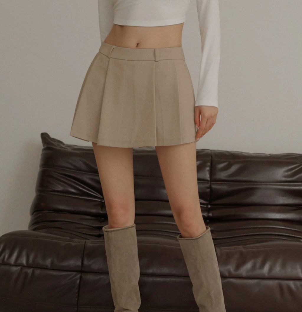 微低腰剪裁搭配前寬褶設計,版型硬挺俐落,可修飾腿部比例。仿天絲牛仔質感柔滑,穿著親膚不悶熱。後腰鬆緊設計提升舒適度。是一款兼具甜感與酷帥感的必備短裙單品。