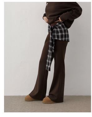 具備包容力的彈性布料,提供順應身形的舒適感受。中腰剪裁收腹並修飾腰際輪廓,配合從膝蓋處些微散開的小喇叭褲型,遮掩了小腿腿型,縱向拉長雙腿,賦予休閒裝束細緻修長的比例。搭配隨附的格紋圍裹短裙,更增添穿搭層次感。