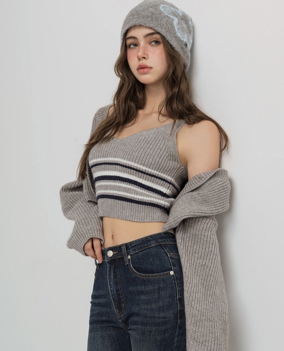V領條紋背心單扣長袖短版開襟針織衫套裝