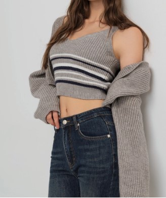 V領針織背心搭配單扣短版開襟衫,背心的多彩條紋給人活潑的印象,短版開襟衫比例能修飾腰身。針織材質輕盈不厚重,分開或成套穿著,皆能輕易完成比例絕佳的日常穿搭造型。