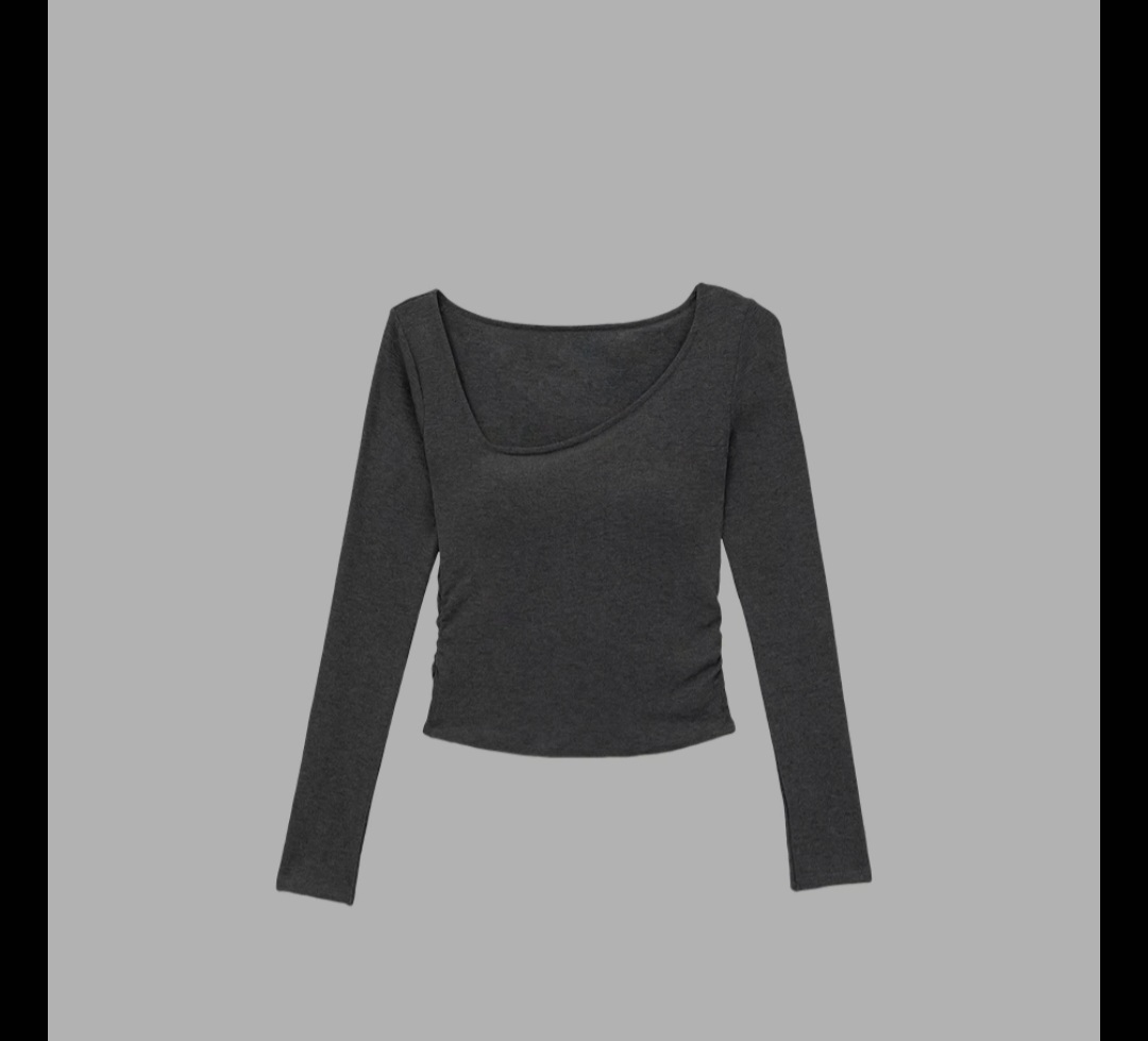 不對稱領側抓皺長袖短版BRA TOP
