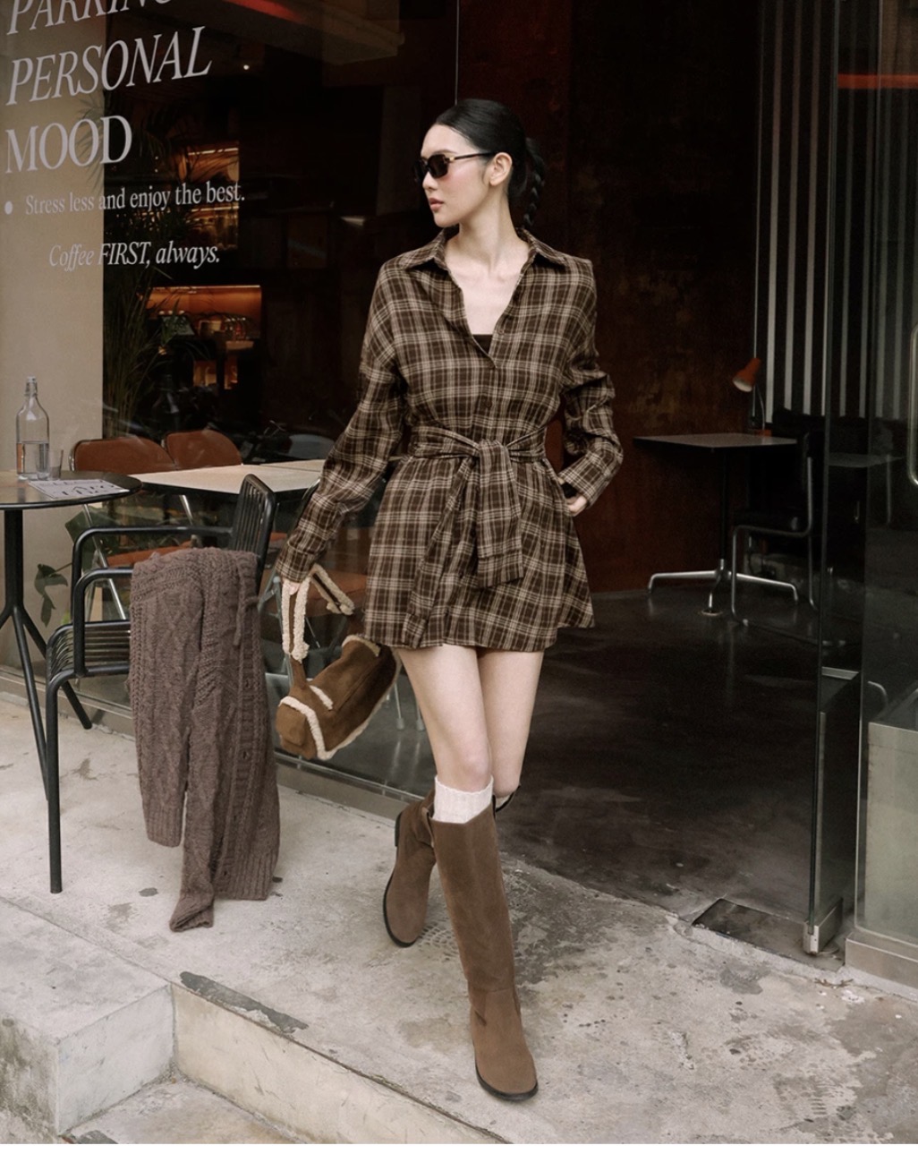 這款襯衫式洋裝採用復古感的格紋面料,略帶厚度適合秋冬季節穿著。腰間的袖子造型綁帶,綁法可隨心變化,創造出漂亮的腰部輪廓。短洋裝樣式,巧妙調整身形,穿出充滿活力的美式休閒風。