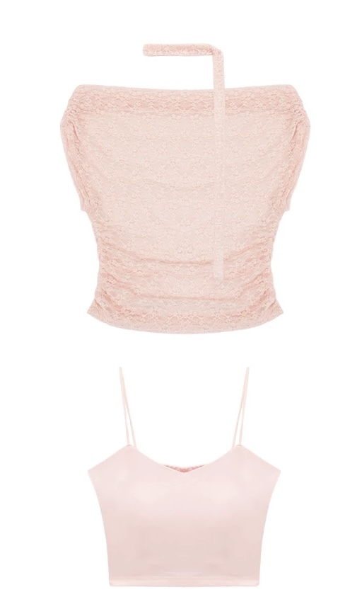 細緻小花蕾絲交織出浪漫氛圍,一字領結合袖子側邊抓皺,讓衣身帶有自然的皺褶層次。內搭細肩帶BRA背心,不用思考內衣搭配問題。附同色蕾絲領巾,可視需求做為穿搭造型的點綴配件。