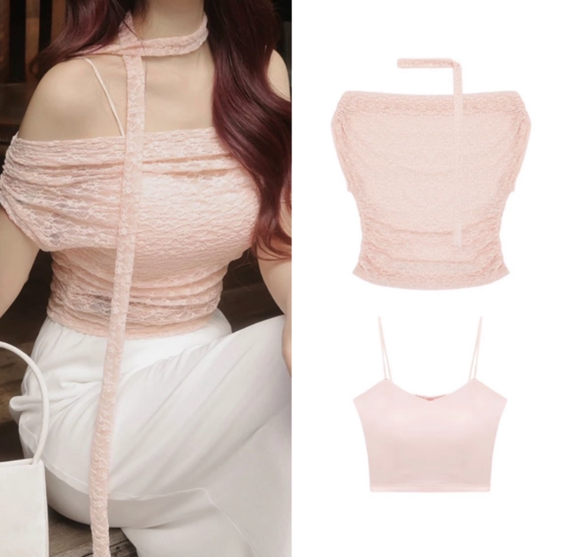 細緻小花蕾絲交織出浪漫氛圍,一字領結合袖子側邊抓皺,讓衣身帶有自然的皺褶層次。內搭細肩帶BRA背心,不用思考內衣搭配問題。附同色蕾絲領巾,可視需求做為穿搭造型的點綴配件。