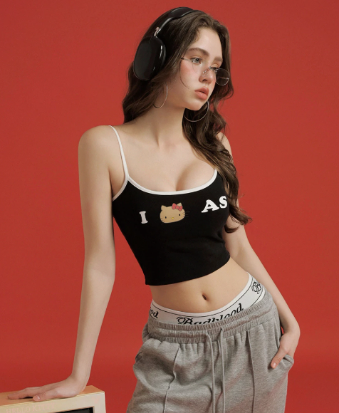 【Hello Kitty聯名】撞色滾邊印花字母細肩帶短版背心(附胸墊)