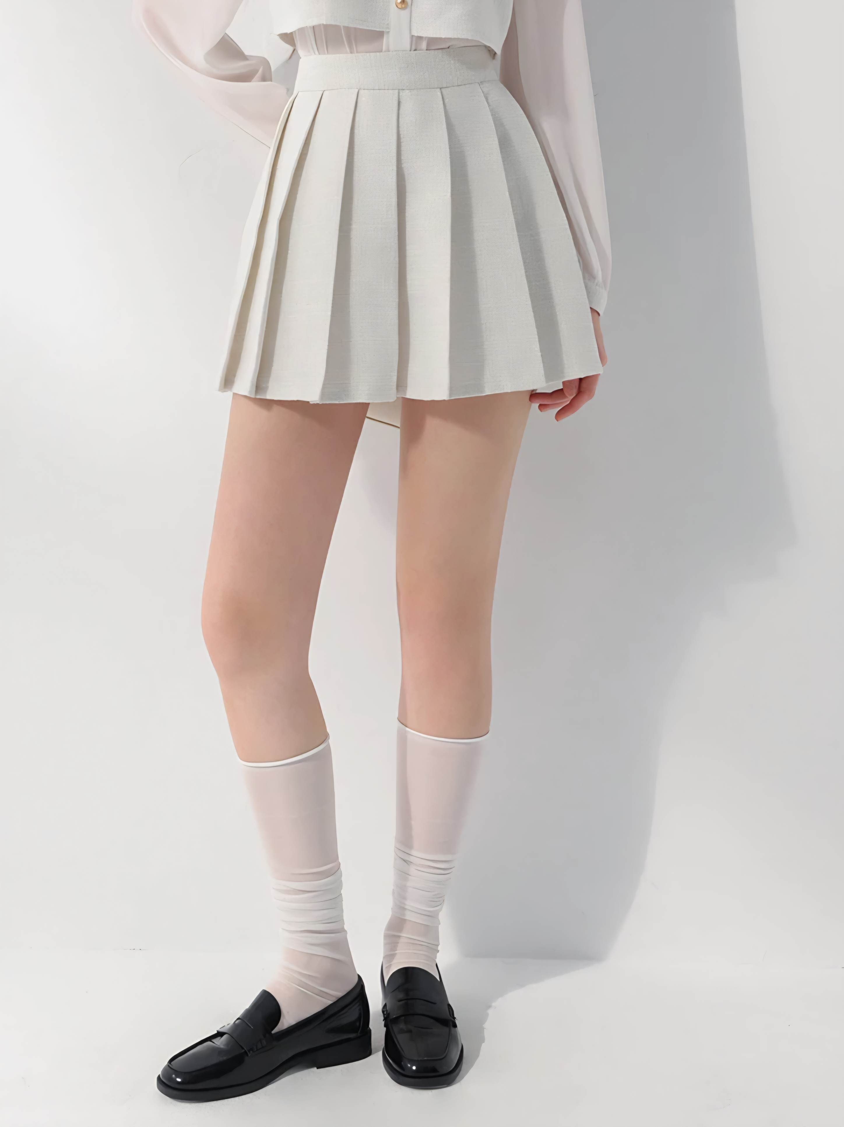 經典的小香風織紋面料,低調展現奢華氣息。帶有挺度的百褶設計,不僅能修飾臀型,更能拉長雙腿比例。後腰附鬆緊帶,增加穿著時的舒適度並友善不同身形。搭配成套的假兩件透膚襯衫輕鬆完成兼具優雅與活力的時尚穿搭風格。