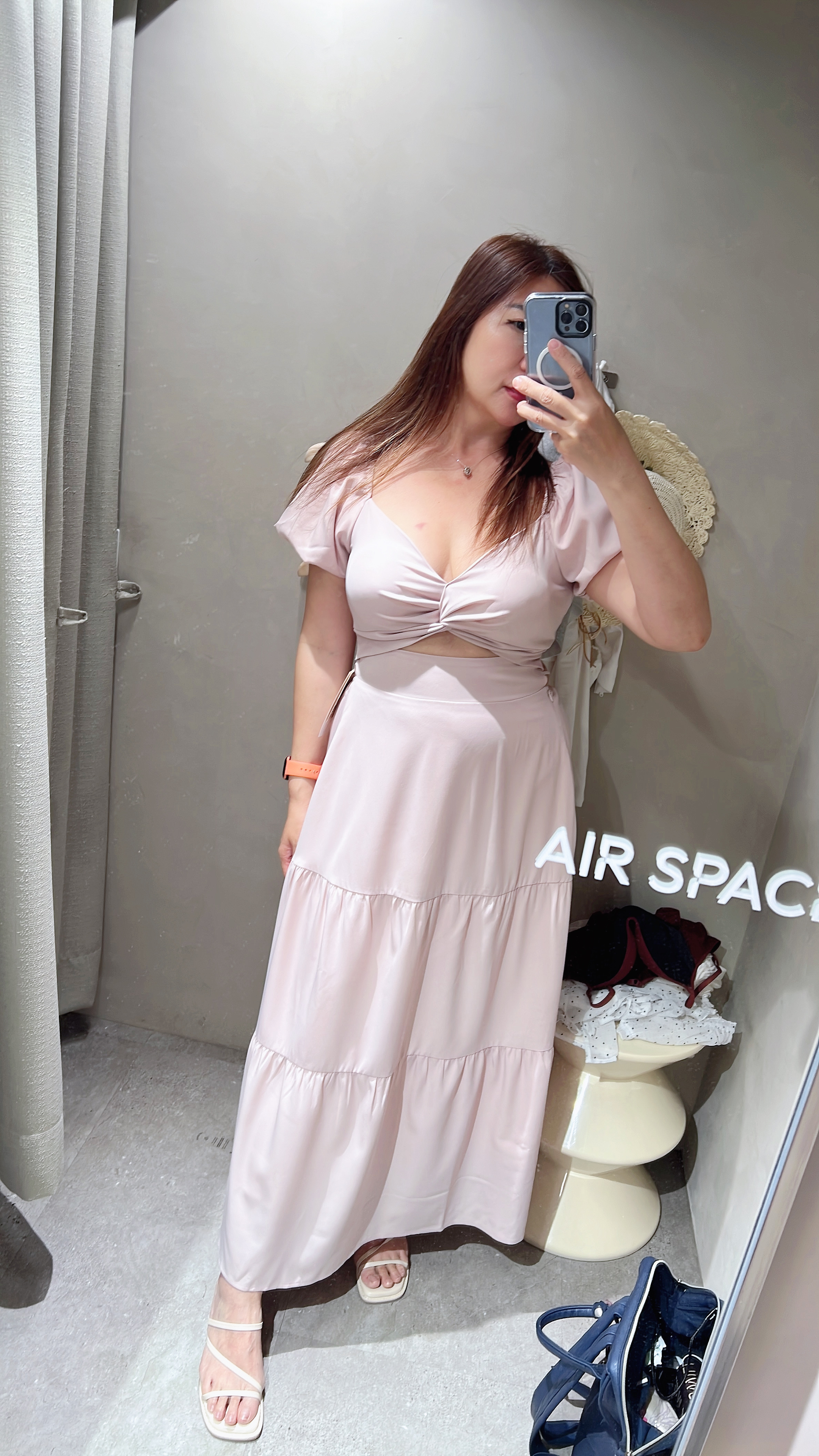 以桃心低領扭結設計結合胸下鏤空剪裁,巧妙展現迷人的腰部線條與微辣感。轉身後是大膽的美背挖空與細緻綁帶,背影也能成為吸睛焦點。公主澎袖、蛋糕裙擺兩者相互呼應,營造出華麗且輕盈的印象。無論是約會或海島度假,都能化身為氣場十足的浪漫系女神。