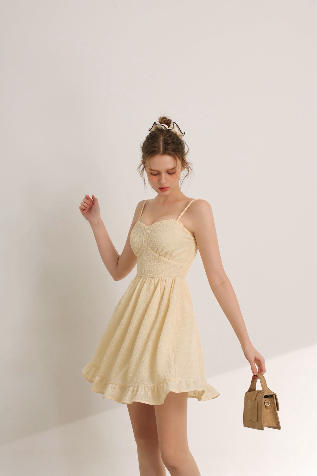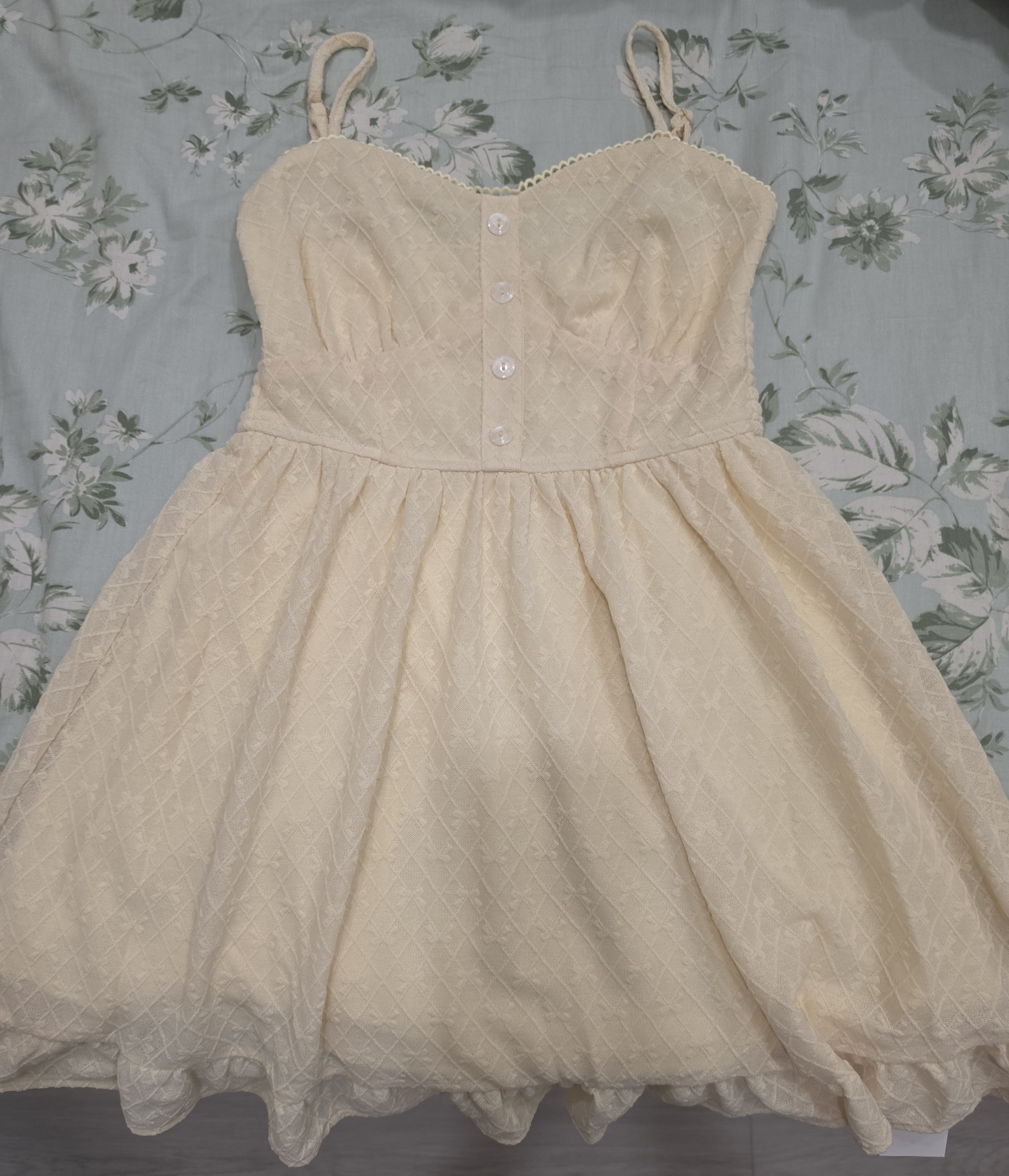 花邊桃心領排扣菱格蕾絲細肩帶荷葉傘擺短洋裝