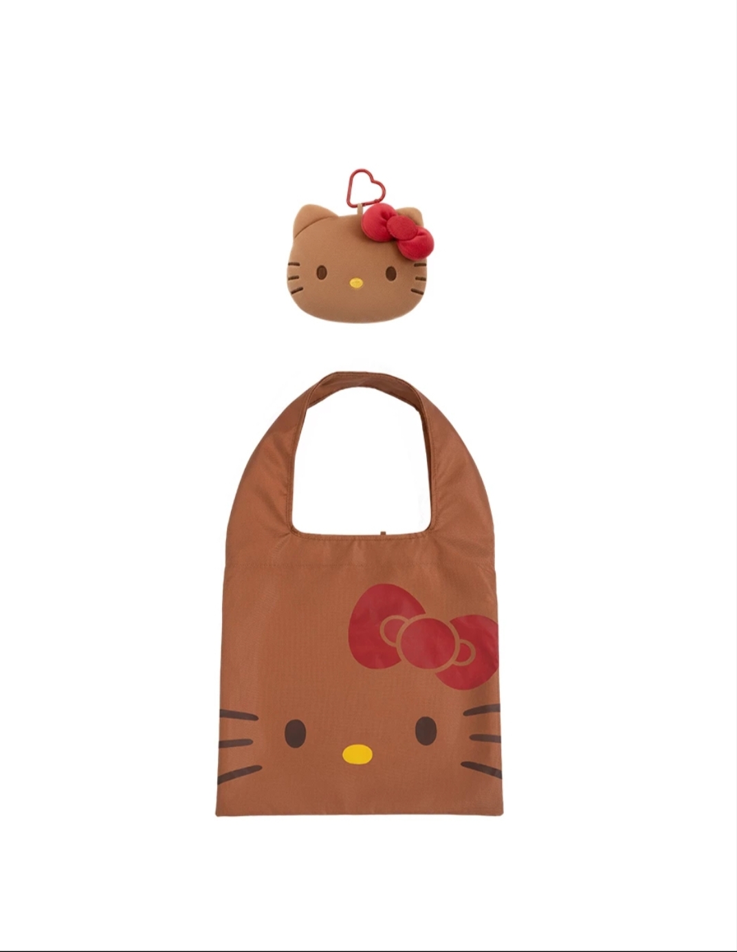 烤焦版Kitty大頭絨毛造型吊飾,可透過紅心造型扣環隨意掛在褲頭或包袋上作為個性點綴。而絨毛造型吊飾內巧妙收納了環保購物袋。Kitty臉部印花的袋身設計呼應復古焦糖色調,大容量可應對日常採買需求,是一件完美平衡潮流美學與便利生活的必備配件。