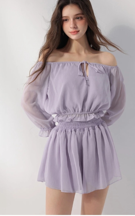 這款雪紡套裝以一字領結合澎袖設計,完美詮釋歐美浪漫美學。透過上下身對應的縮褶鬆緊腰計,輕鬆穿出顯瘦的曲線。高腰傘擺短褲在視覺上極致修飾臀腿線條,不論是度假約會或日常出遊,都能展現不費力的優雅時髦感。