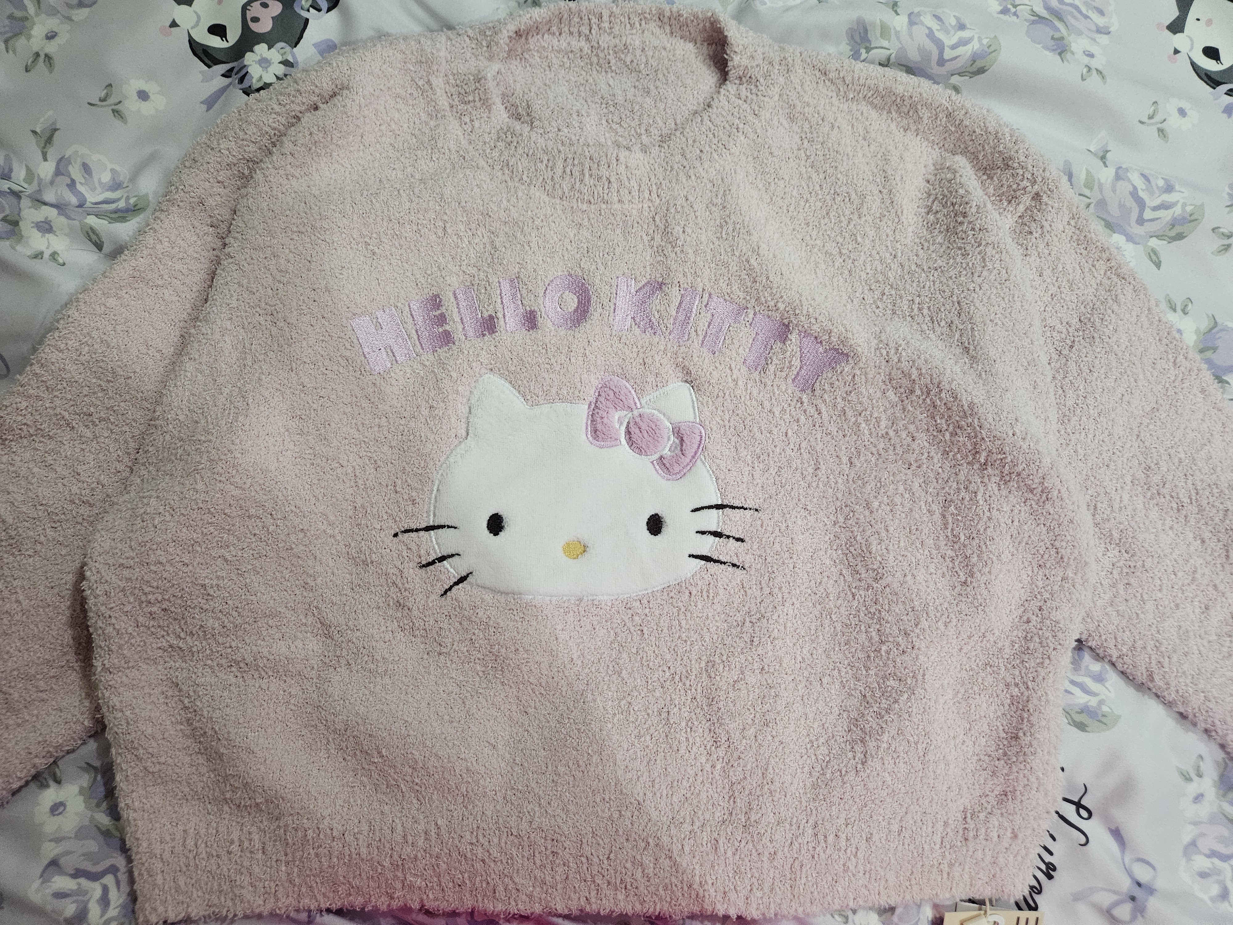 珊瑚絨毛衣材質材質很舒服,搭配粉色蝴蝶結的kitty臉,超可愛,這粉色毛衣顏色超喜歡🩷