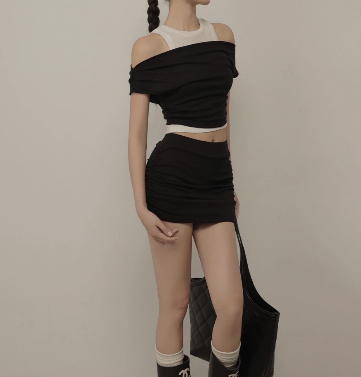 一字領抓皺短袖短版上衣削肩背心撞色套裝