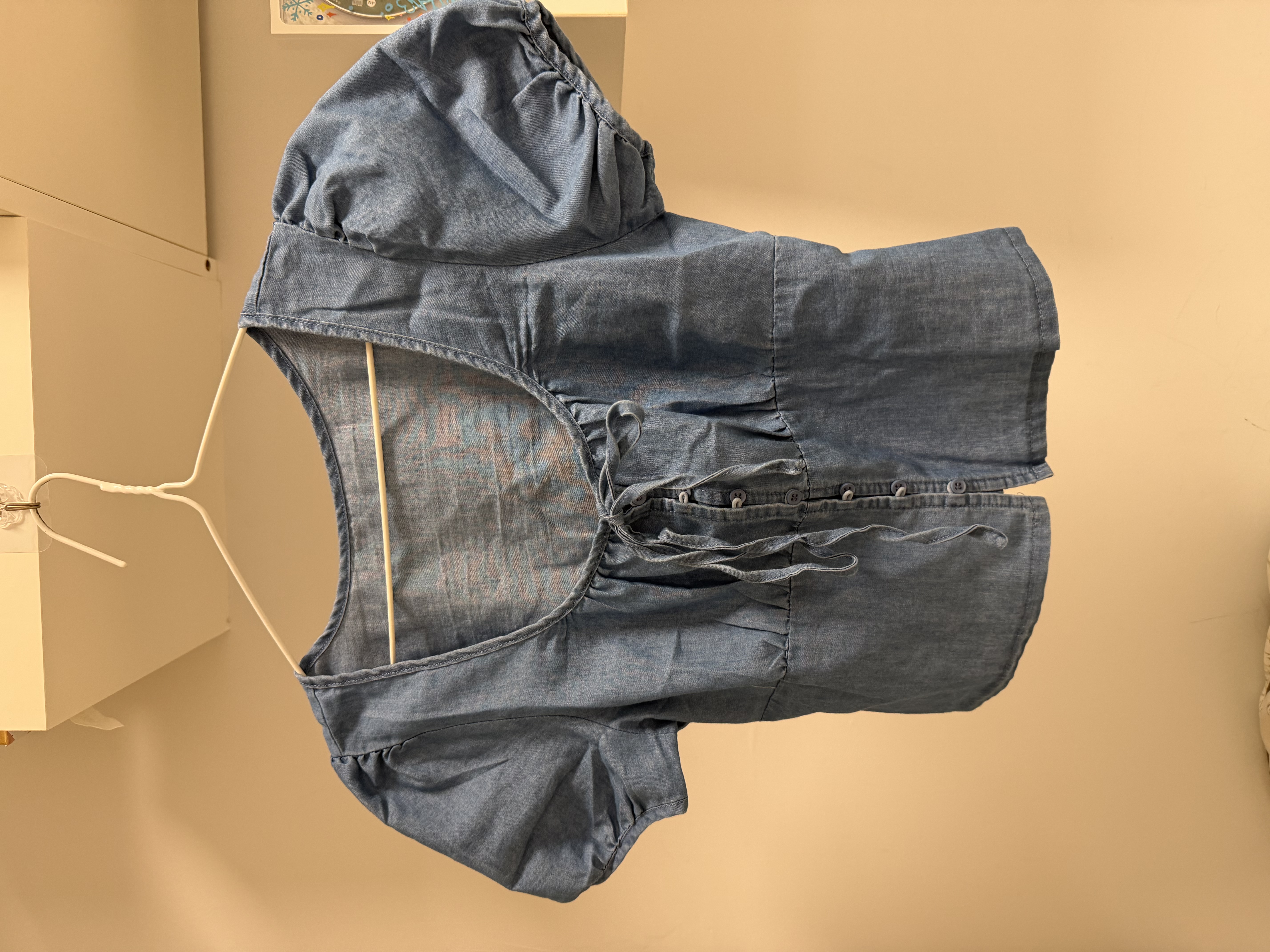 方領抓皺綁帶澎袖短版水洗牛仔上衣
