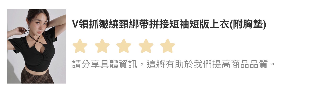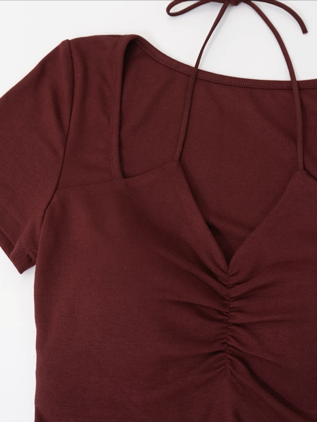 V領抓皺繞頸綁帶拼接短袖短版上衣(附胸墊)