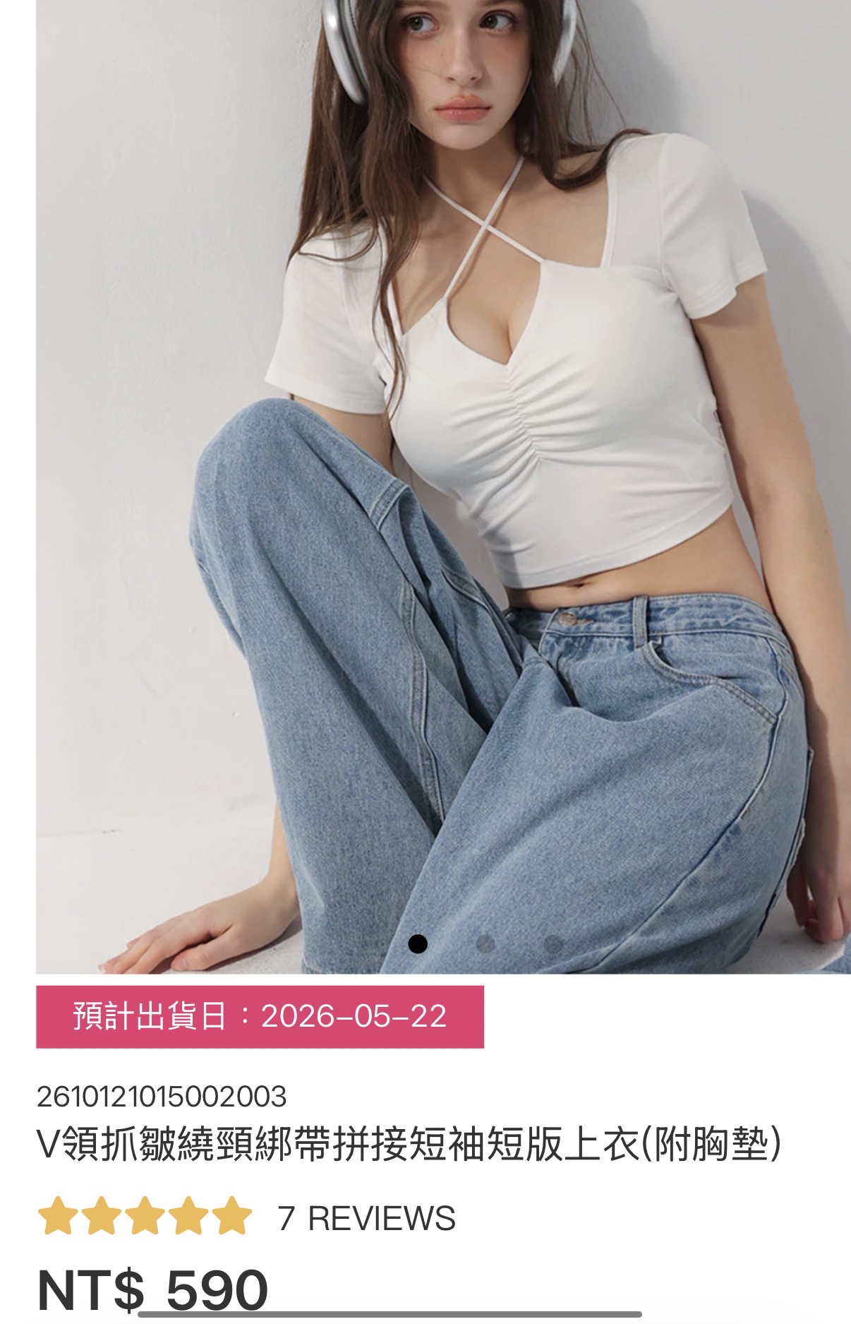 V領抓皺繞頸綁帶拼接短袖短版上衣(附胸墊)