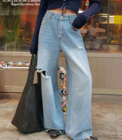 低腰刷破設計水洗牛仔寬褲