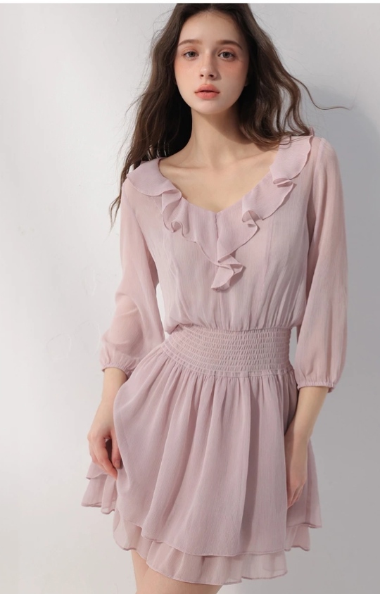 V領荷葉邊七分袖皺褶收腰雙層傘擺透膚雪紡短洋裝