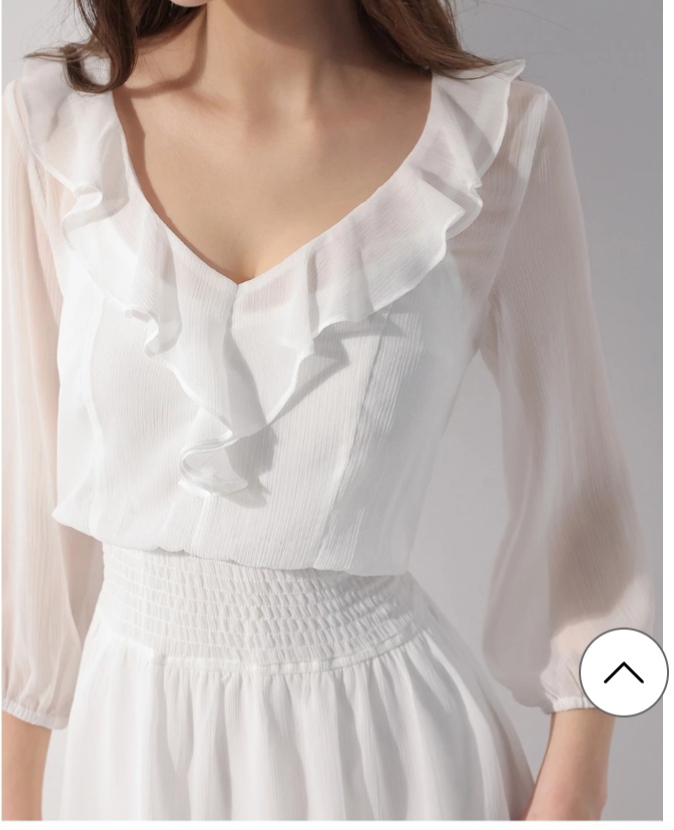 領口細緻的荷葉邊裝飾結合V領,可修飾臉型。輕盈的雪紡面料,帶有微微透膚感,充滿浪漫氛圍。腰間打攬收腰設計塑造纖細腰身,結合雙層傘型短裙擺,將柔美甜感發揮極致,是一款仙氣滿點的洋裝單品。