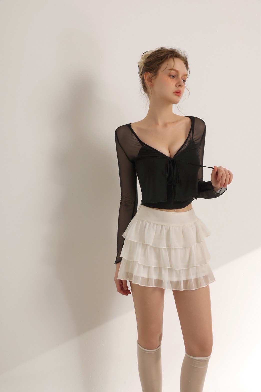 V領綁帶木耳邊透紗長袖罩衫交叉抓褶細肩帶BRA背心套裝