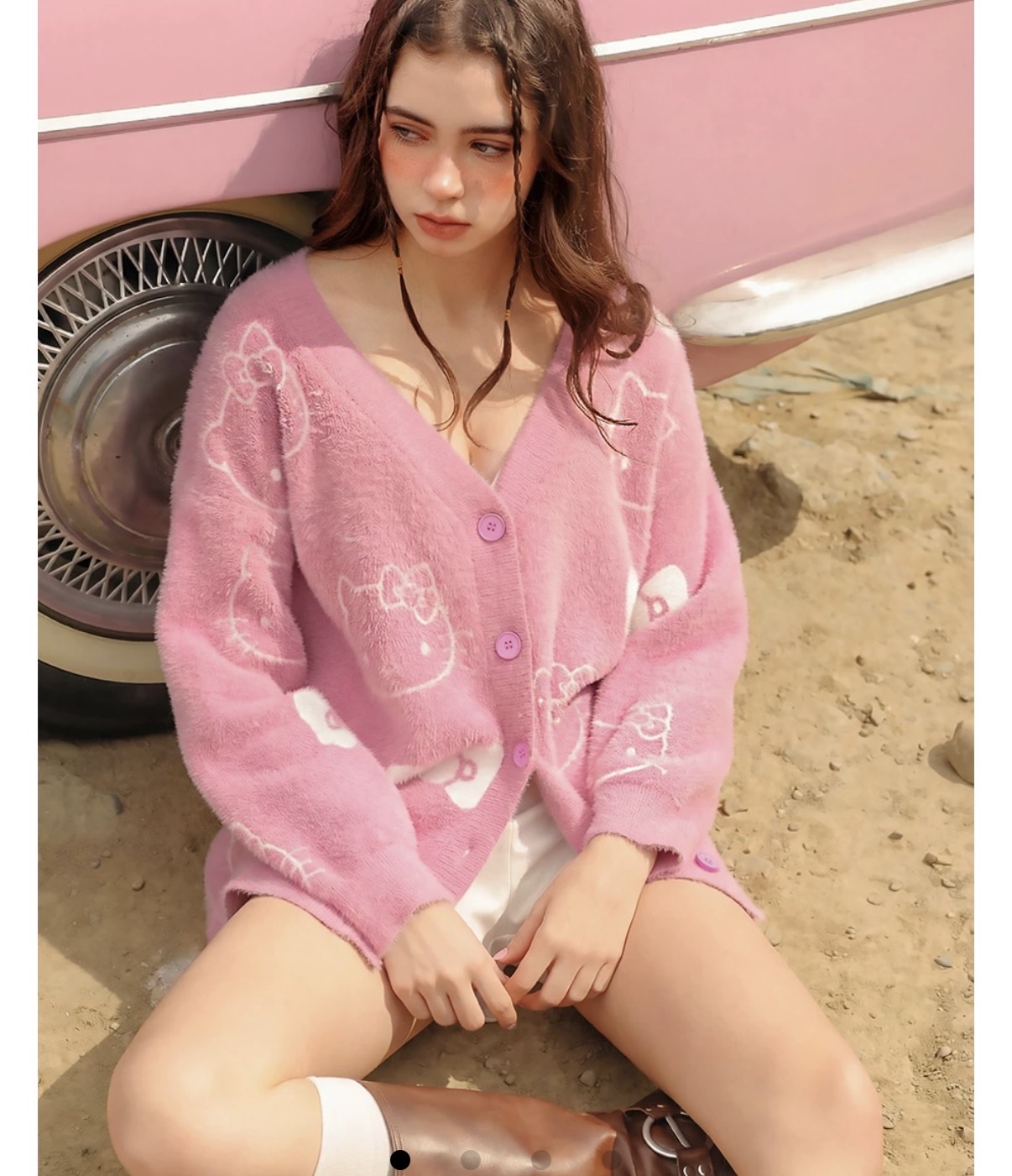 以滿版 Kitty 緹花圖案打造高辨識度視覺,軟綿絨毛針織材質,輕盈不厚重。V 領剪裁修飾臉型與頸部線條,寬鬆長版型舒適並帶點慵懶感,是甜辛風穿搭不可或的單品。