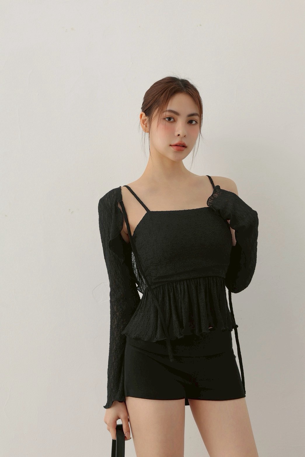 綁帶開襟木耳邊長袖蕾絲罩衫荷葉下擺細肩帶背心套裝(附胸墊)綁帶開襟木耳邊長袖蕾絲罩衫荷葉下擺細肩帶背心套裝(附胸墊)